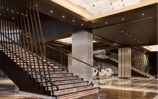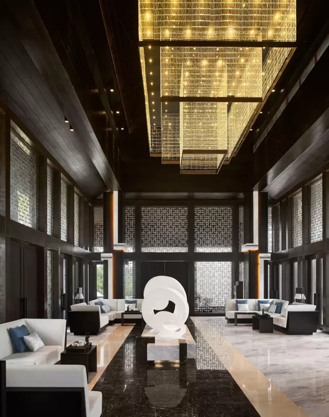 酒店的公共空間同樣延續(xù)了對(duì)質(zhì)感、材料和對(duì)比性的注重。富有美感的深色木材和質(zhì)樸的藤條與酒店莊重的建筑風(fēng)格形成強(qiáng)烈對(duì)比,讓客人感受到純正的工藝并沉浸到彰顯希爾頓及HBA奢華水準(zhǔn)的環(huán)境中。HBA將當(dāng)?shù)匚幕厝谌氲竭@間五星級(jí)酒店中,以此向文昌的歷史、起源和傳統(tǒng)致敬。