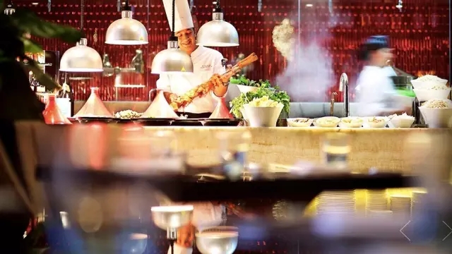 為了讓住客“早餐吃得像皇帝”,王健林特地在大堂的巨幅壁畫后藏了一間自助餐廳,4個開放式廚房源源不斷輸出世界各地的美食,你沒吃爽,王總是不好意思讓你出門的。