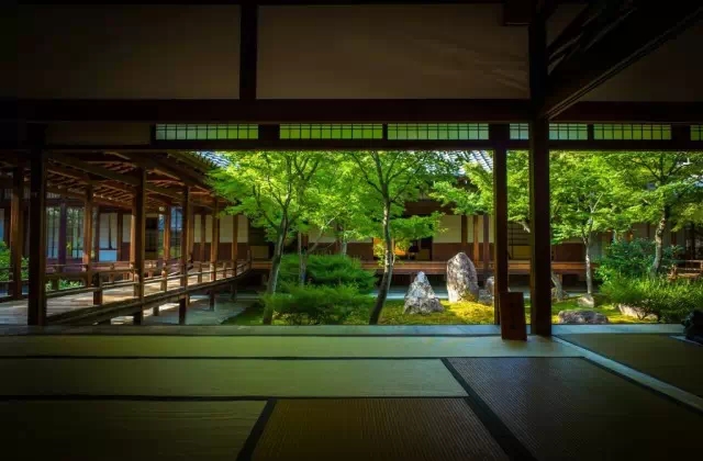 回字型的主入口藏在一條與古寺一墻之隔的悠長(zhǎng)石徑盡頭、由巨幅落地窗包裹的大堂和客房都朝向落英繽紛的水景庭院。