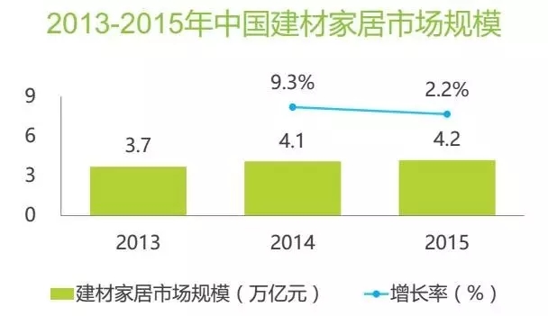 2015年我國(guó)建材家居市場(chǎng)規(guī)模達(dá)4.2萬(wàn)億元。該行業(yè)互聯(lián)網(wǎng)滲透率僅為4.0%,有較高的增長(zhǎng)空間,預(yù)計(jì)互聯(lián)網(wǎng)家裝會(huì)繼續(xù)保持增長(zhǎng)態(tài)勢(shì)。