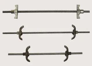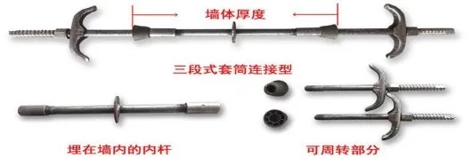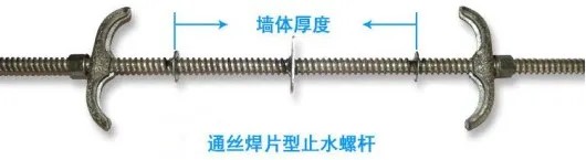 對(duì)拉螺桿多用于豎向構(gòu)件模板的加固桿件,另兩端均配設(shè)固定件(山形帽或成品鐵板墊塊)和螺帽限位,起到固定模板的效果。目前市場(chǎng)螺桿的種類(lèi)繁雜,一般用于房建工程的螺桿均采用Q235的圓鋼進(jìn)行滾絲制作,直徑為M14(鋁模除外,其采用Tr18型),長(zhǎng)度根據(jù)相應(yīng)墻厚進(jìn)行配設(shè)。根據(jù)豎向結(jié)構(gòu)防水要求將螺桿主要分為通絲螺桿和止水螺桿。