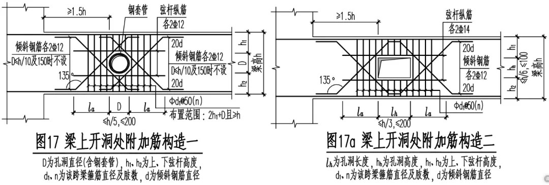 梁上開洞,因?yàn)楦淖兞肆菏芰μ匦?,因此必?/span>采用附加筋補(bǔ)強(qiáng)措施,設(shè)計(jì)進(jìn)行力學(xué)計(jì)算后出具大樣圖,嚴(yán)格依圖施工。某項(xiàng)目水管和風(fēng)管穿梁開洞構(gòu)造示意圖: