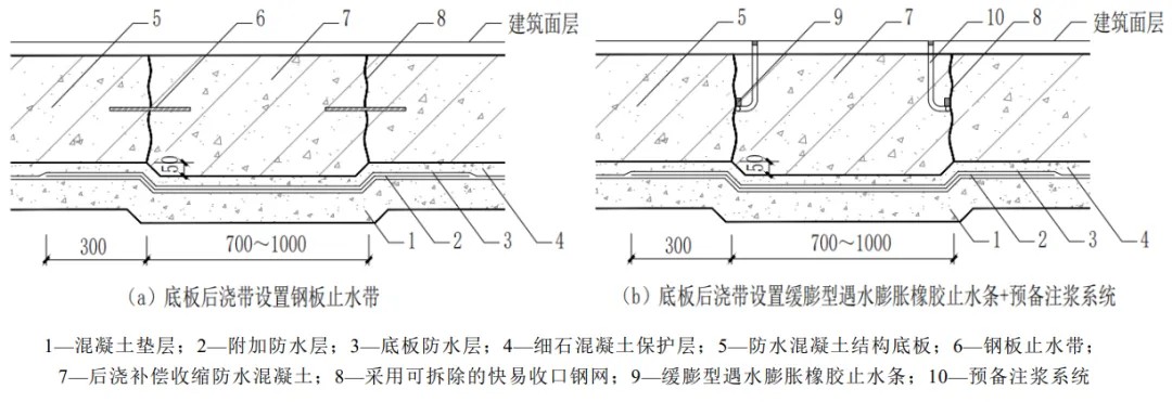 基于規(guī)范,后澆帶應(yīng)設(shè)置在機構(gòu)受力較小處,采用補償收縮混凝土澆筑,且強度等級和抗?jié)B等級均應(yīng)高于兩側(cè)混凝土,后澆帶處鋼筋不得斷開,中部通常設(shè)置止水鋼板止水帶或遇水膨脹止水條,迎水面設(shè)置附加防水層。