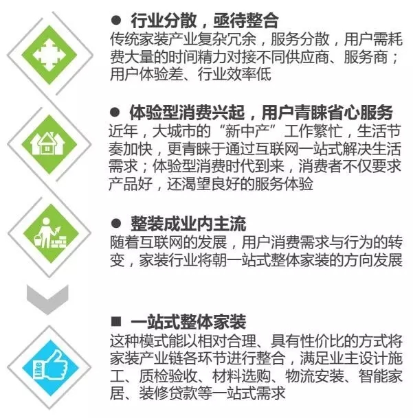 家裝行業(yè)各方面逐步走向多方整合、協(xié)同發(fā)展。產(chǎn)品方面,線上的產(chǎn)品功能與線下服務(wù)保持統(tǒng)一;供應(yīng)鏈方面,集中采購(gòu)和供應(yīng)鏈的重新組合,使產(chǎn)品品牌越來(lái)越聚焦;設(shè)計(jì)方面,逐步一體化,增強(qiáng)了產(chǎn)品的整體銷售力;服務(wù)方面,高效保質(zhì)的服務(wù)鏈保障了用戶的體驗(yàn)。
