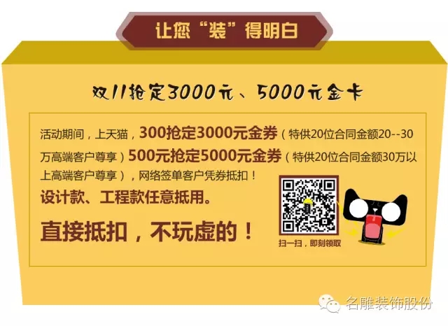第二種是活動(dòng)促銷套路,有些家裝公司會(huì)搞各種營銷優(yōu)惠,看上去折扣的力度很大,其實(shí)到頭來并不見得是優(yōu)惠,后期還可能通過其他手段增加費(fèi)用。而這一次我們推出了天貓金券,在活動(dòng)期間上我們的天貓旗艦店,就有機(jī)會(huì)搶定3000元、5000千元的金券,兩種金券各限量20位,只要搶到金券便能任意抵用設(shè)計(jì)款、工程款。這也是名雕今年優(yōu)惠力度最大的網(wǎng)絡(luò)活動(dòng),恰逢雙十一,我們也想給到我們客戶更優(yōu)性價(jià)比的家裝服務(wù)體驗(yàn)。(轉(zhuǎn)載自新浪家居)