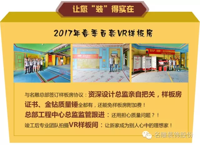 為了保證工程品質(zhì),我們嚴(yán)格執(zhí)行108項(xiàng)驗(yàn)收標(biāo)準(zhǔn),保證每一個(gè)工程都是金鉆品質(zhì)。這次的活動(dòng)我們將金鉆工程與當(dāng)下非常熱門的VR相結(jié)合,推出2017年春季百套VR樣板房征集活動(dòng),并由名雕總部工程總控中心全程跟進(jìn),頒發(fā)樣板房證書以及金鉆質(zhì)量錘,業(yè)主只要覺得哪里不滿意便可砸掉重來,杜絕家裝中的品質(zhì)套路。