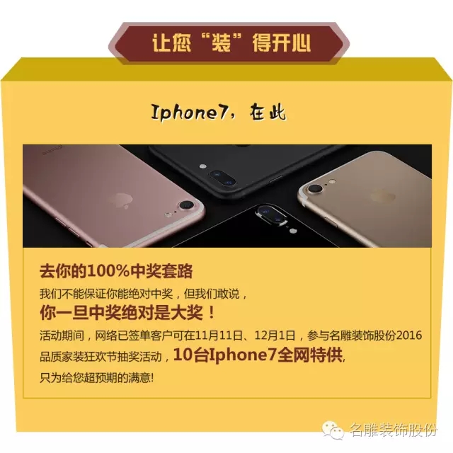 這10臺(tái)iPhone7是為我們網(wǎng)絡(luò)簽單客戶而準(zhǔn)備的,不過整個(gè)抽獎(jiǎng)活動(dòng)是有時(shí)間節(jié)點(diǎn)的,只有在11月1日以后通過我們網(wǎng)絡(luò)平臺(tái)簽單的客戶,才有機(jī)會(huì)在11月11以及12月1日當(dāng)天抽取大獎(jiǎng)。同樣的,獎(jiǎng)品我們也不玩套路,中獎(jiǎng)直接就是iPhone 7,我們不設(shè)置小獎(jiǎng)來充數(shù)。(轉(zhuǎn)載自新浪家居)