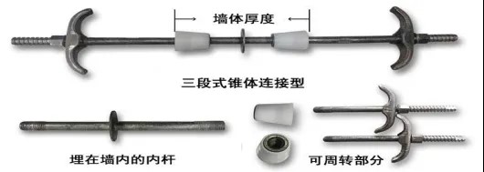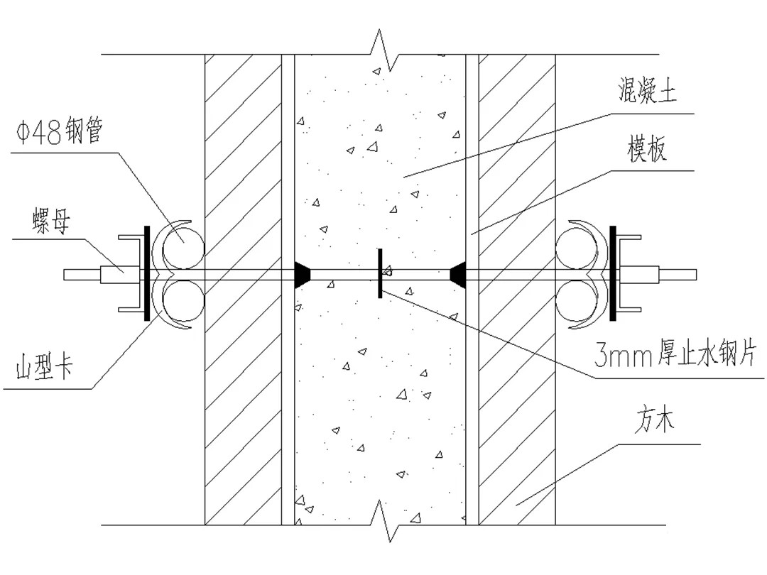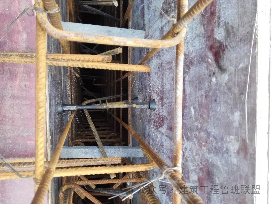 對(duì)拉螺桿多用于豎向構(gòu)件模板的加固桿件,另兩端均配設(shè)固定件(山形帽或成品鐵板墊塊)和螺帽限位,起到固定模板的效果。目前市場(chǎng)螺桿的種類(lèi)繁雜,一般用于房建工程的螺桿均采用Q235的圓鋼進(jìn)行滾絲制作,直徑為M14(鋁模除外,其采用Tr18型),長(zhǎng)度根據(jù)相應(yīng)墻厚進(jìn)行配設(shè)。根據(jù)豎向結(jié)構(gòu)防水要求將螺桿主要分為通絲螺桿和止水螺桿。