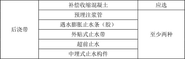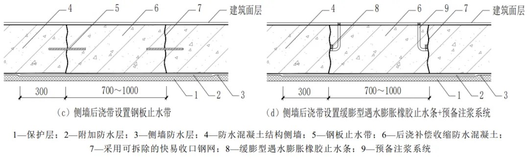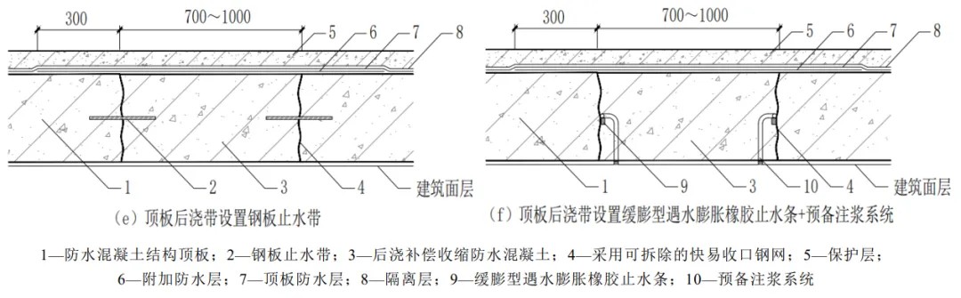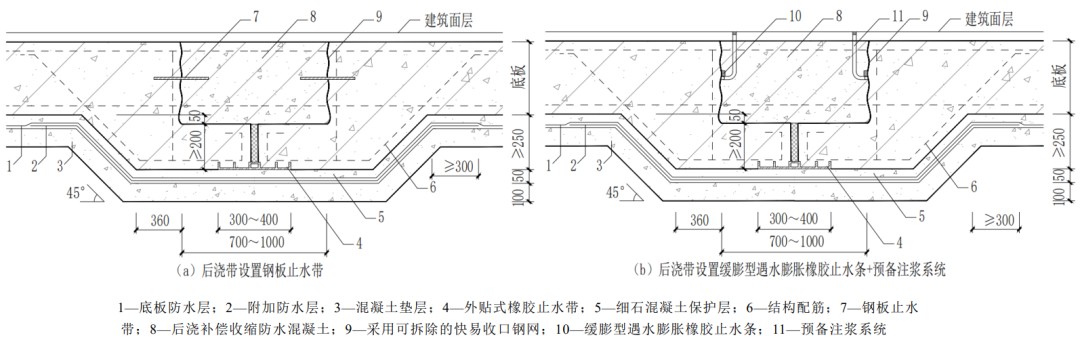 基于規(guī)范,后澆帶應(yīng)設(shè)置在機構(gòu)受力較小處,采用補償收縮混凝土澆筑,且強度等級和抗?jié)B等級均應(yīng)高于兩側(cè)混凝土,后澆帶處鋼筋不得斷開,中部通常設(shè)置止水鋼板止水帶或遇水膨脹止水條,迎水面設(shè)置附加防水層。